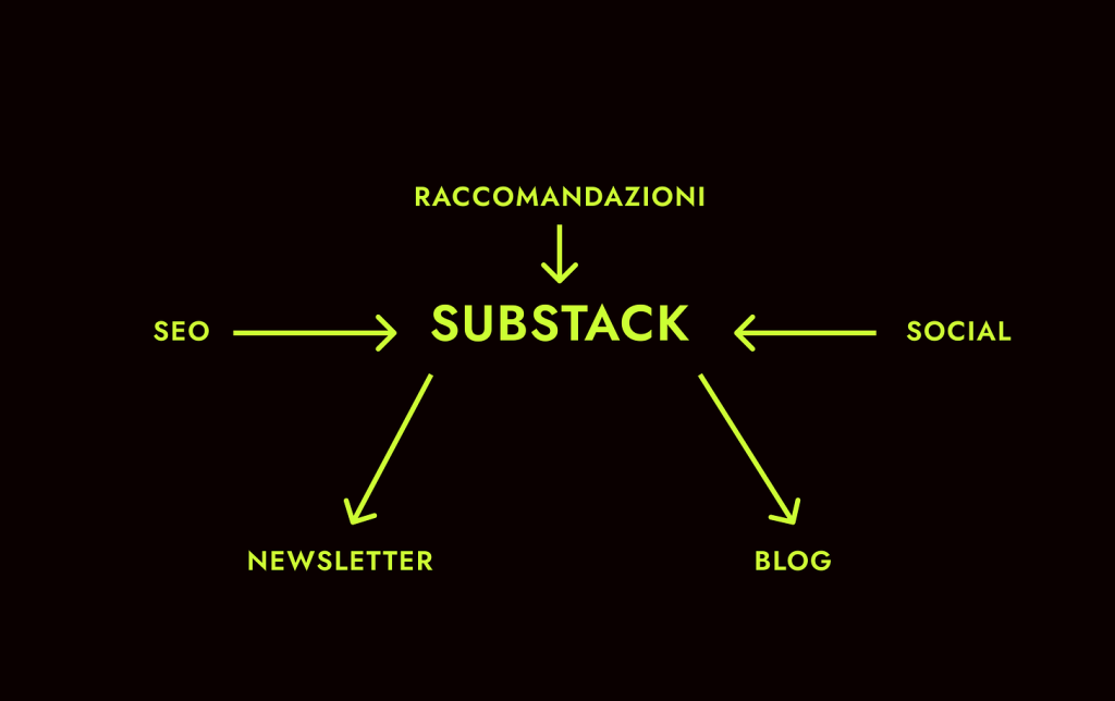 Il segreto di Substack è stato quindi quello di aver saputo unire il meglio delle newsletter, dei blog e mutuare al contempo anche alcune leve dai social network. La sua forza è quindi quella di essere sia piattaforma di distribuzione, che di lead generation permettendo di far crescere la propria audience in modo organico: il suo sistema interno di raccomandazione è in grado di generare nuove iscrizioni (una novità per le newsletter, come i blogroll o webring di una volta).