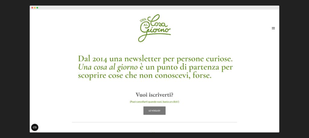 Nel 2014 era in una fase calante perché i social erano predominanti non tanto in termini di persone che li utilizzavano, quanto in termini di considerazione. Decisi allora di andare dove c’era meno attenzione e dove mi interessava rivolgere lo sguardo: dare la possibilità di ricevere una email del mattino con qualcosa che non ti aspetti. Stimolare piacere e curiosità in maniera casuale. La caratteristica di Una cosa al giorno, che nel tempo ha fatto piccolissime modifiche al suo essere, è quella di avere un titolo, una riga massimo due di testo e un bottone con scritto CLICCA. Nel 90% dei casi il tutto non ti fa capire cosa aprirai cliccando sul link. Comunque nel 2014 c’erano già molte newsletter in giro, ma non molte sono sopravvissute in questi anni.